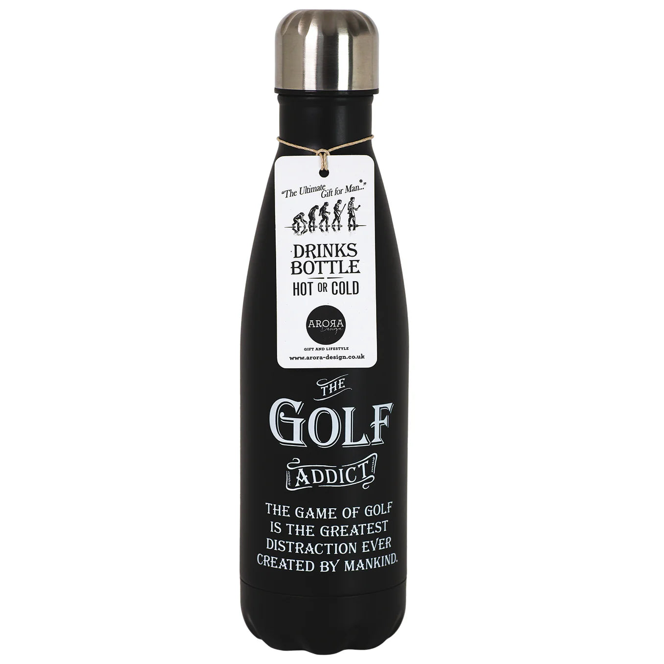 The Golf Addict Drinks Bottle, insulated stainless steel water bottle for hot or cold drinks, black reusable sports bottle gift for golf lovers