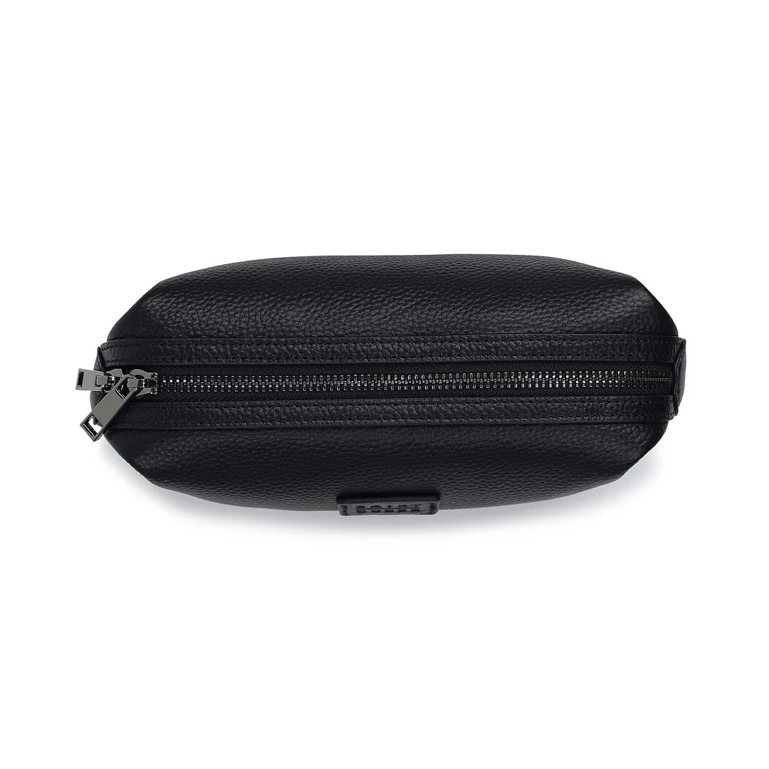 Made from 100% genuine, full grain soft black pebble leather, you’ll immediately notice the luxurious soft feel. The flat base ensures it sits securely on the vanity and side clasps can be unclipped to allow for an even bigger opening or closed to double up as a handy way to carry the bag, while on the move.